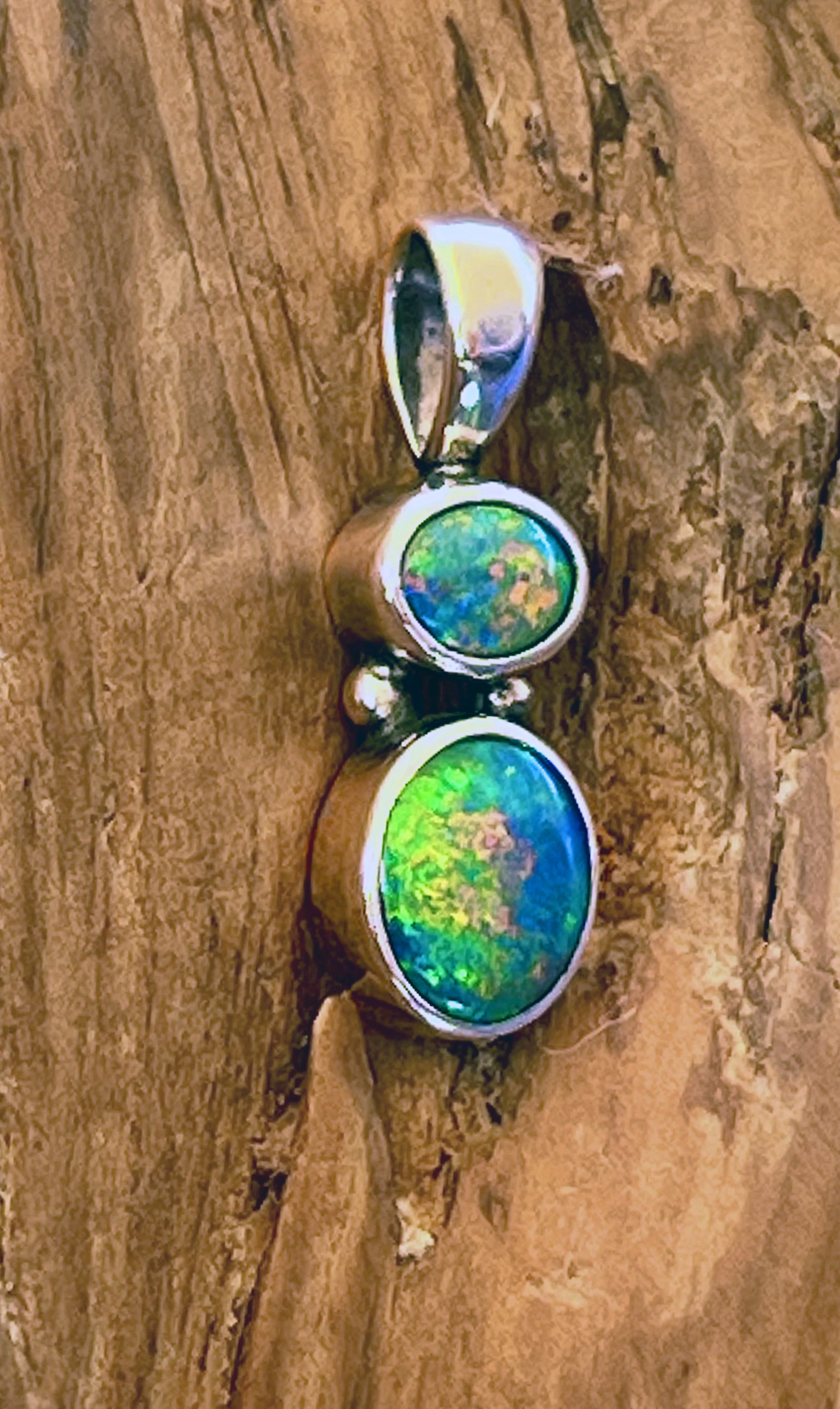 A refined pendant featuring two solid Lightning Ridge opals, personally mined, cut, and polished. The stones were selected to complement each other naturally, creating a balanced and elegant vertical design.